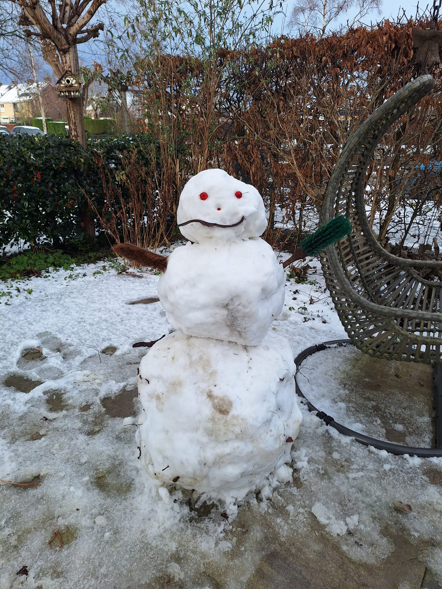 En soms brengt de winter ook een glimlach. De kinderen van onze trouwe klusvrijwilliger maakten een vrolijke sneeuwpop in de tuin – een klein kunstwerkje dat even licht en speelsheid bracht in de winterse stilte.
